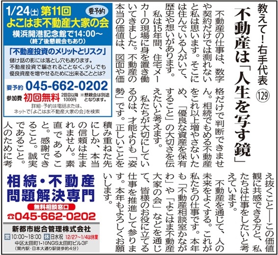 不動産を通じて、人の未来をよくする。これが私たちの仕事です。本年も「不動産相談室かながわ」や「よこはま不動産大家の会」などを通じて、皆様のお役に立てる仕事を推進して参ります。